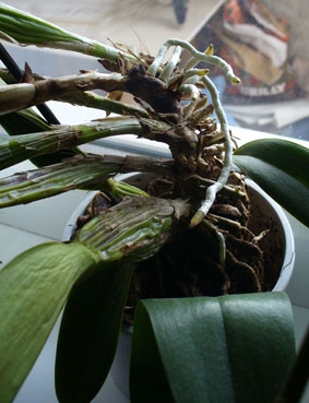 Но, дело в том, что у каттлеи идет перевес за счет лисьев, приходится листьями упирать ее в соседний горшок с дифенбахией! Усиленно начали расти корни и бульбы (тьфу, тьфу, тьфу). После покупки не пересаживала, а сейчас весной, думаю самое время