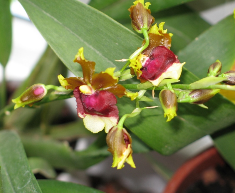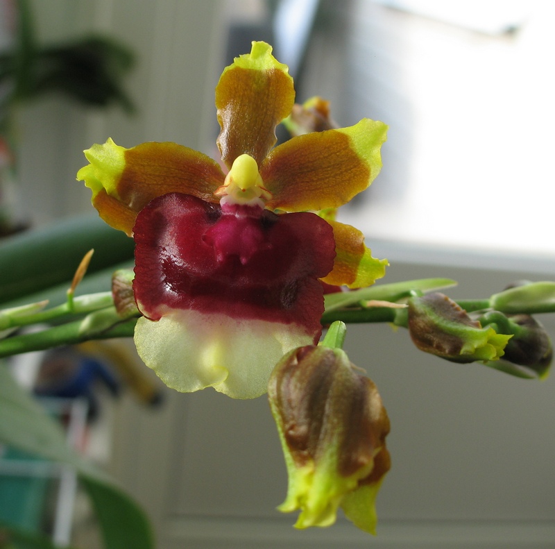 Это мильтонидиум Hawaiian Sunset. Весной купила засушенное несчастье в уценке( за 20грн. отдали), жалко стало. Принесла домой-обнаружила цветонос.Цвел так же, но недолго - цветонос удалила и стала вычухивать. Растень беспроблемная вообще :отрастил 2 новых бульбы,сейчас 2 цветоноса.