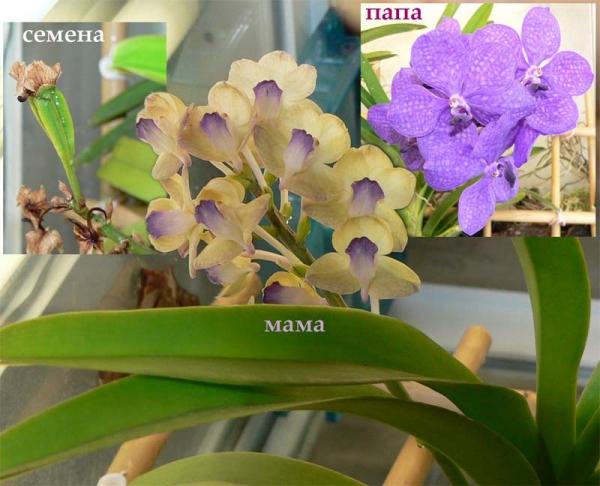 Попытка создания гибрида Vanda Mimi Palmer и Ascocenda Princess Mikasa blue - завершилась неудачей, семенная коробочка стремительно разрастаясь внезапно почернела, порчернел весь цветонос, остальные цветы осыпались раньше, и цветнос отвалился, в общем.