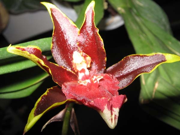 Моя любимая Колмонара - Colnara Wild Cat "Bloodshoot" (Названьице-то какое!)) - цветёт бордово-чёрными лоснящимися бархатными цветками с ярко-салатовой окантовкой по краям , и бордово-красной губой! Сочетание цветов просто изумительное! При фотографировании со вспышкой, или на окне на просвет - выглядит кроваво-красным цветком с салатово-жёлтыми кончиками.