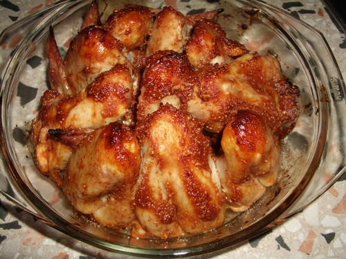 в общем берем любые части курицы (в оригинальном рецепте было филе на кости, но можно брать что угодно, единтвенное - крылья все-таки не очень подойдут): обжариваем до золотистой корочки на большой огне, выкладываем в форму для запекания. Готовим соус: горчица, соль, перец, тертый пармезан, измельченный чеснок и петрушка, сухой измельченный орегано, базилик (тут можно что угодно по вкусу класть), подсолнечное масло (какое вам больше нравится, я готовлю на кукурузном) все это перемешиваем - должна получится масса консистенции сметаны, смазываем курицу, сверху выкладываем помидры черри, разрезанные напополам (можно обойтись и обычными, в принципе) и запекаем до образования золотистой корочки. Мне очень понарвилось!