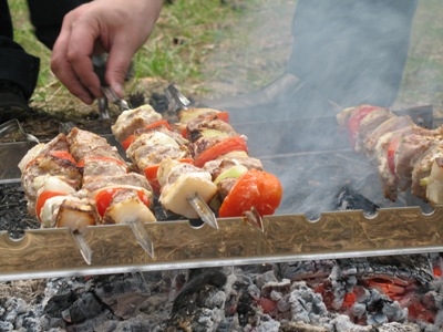 С вечера порезала кусками свежее мясо (задняя часть, можно ошеек но я не люблю очень жирное) посолила, добавила специи для шашлыка ( на Дарницком базаре продают на развес какие хочеш , я там всегда беру стопочка 5 грн., ну очень СУПЕРОВЫЕ). Далее майонез Олком провансаль, все перемешала и выложыла в кострюлю слоями слой мяса, слой лука репчатого порезаного на 4 части ( кольцами я не режу т.к. потом при жарке спадает, и помидоры тоже лучше на 4 части ( лучше держаться) поставила в холодильник. Утром на природу.
