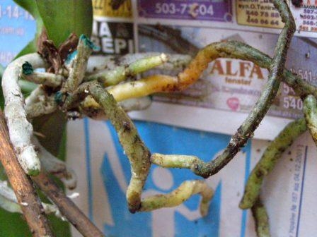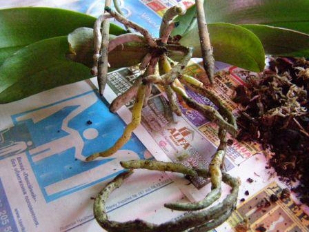 недождавшись ответа..обрезала желтые корни..оставила только серенькие и чистые..посадила в новую кору..не поливала..побрызгала..теперь бум ждать..