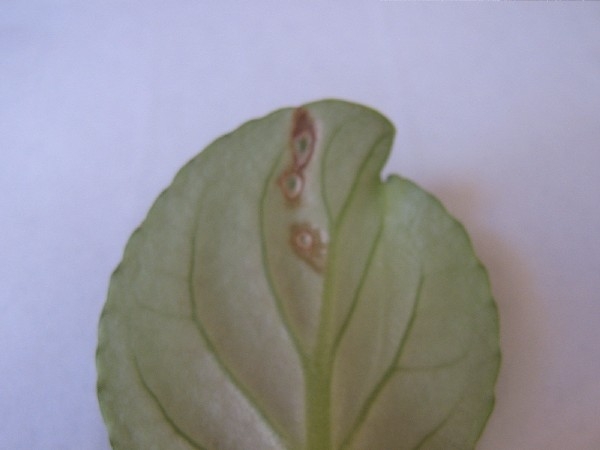 Неужели от воды и солнца могут быть дыры на листе? К сожалению, толком не могу сообразить когда появились такие дырки. Может, действительно, когда летом-осенью стояли на подоконнике... Вроде больше ничего подобного на листиках нет.