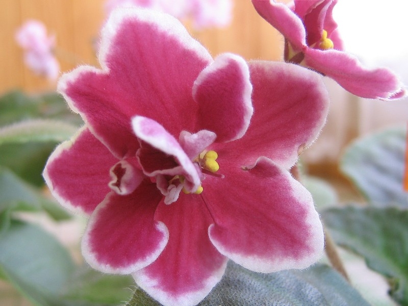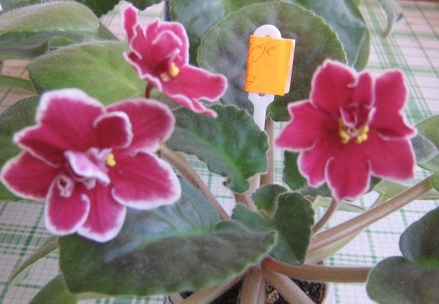 Крупная полумахровая красная звезда с белой каймой и волнистыми лепестками. Средне-зеленые простые листья.