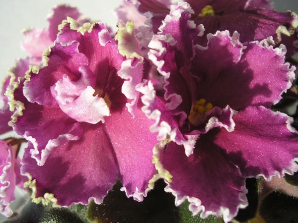 Простые-полумахровые светло-бургундско-красные звёзды с более тёмными краями и тонкой гофрированной салатово-золотистой каймой. Листья - тёмные, гофрированные, с красной изнанкой. Стандарт.