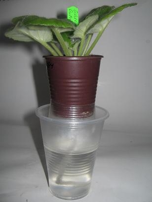 Одна из простейших это берём коробку из под сока и вырезаем лезвием в ней отверстия равные окружности дна стаканчика.В коробку вместимость воды 1,5литра,на месяц можно забыть о поливе.