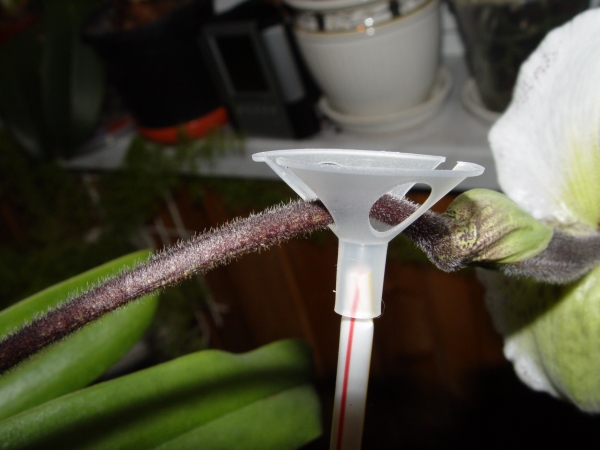 Для этого можно использовать деревянную палочку, а можно -трубочку для коктейля. Опорой, совершенно не травмирующей стебель /в данном случае - цветонос/ служит пластиковый зажим для надувного шарика.