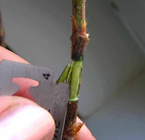 Видно наплывы каллюса, древесина затянулась лубом (зелёный срез), справа проклюнулись корешки