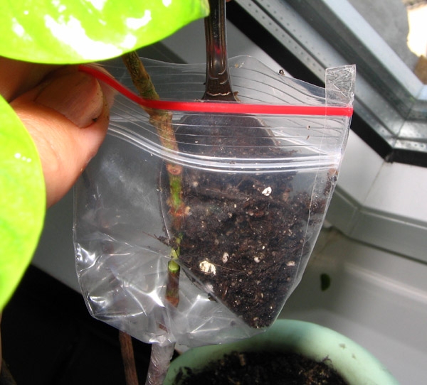 Смысл способа состоит в том, что у выбранной веточки срезается лезвием кольцо коры шириной около 1 см, надевается полиэтиленовый пакет, привязанный сверху и снизу разреза и наполненный землёй (сфагнумом, перлитом, любой другой смесью). Субстрат внутри пакета должен быть всегда влажный.
