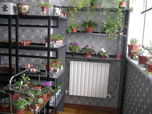 Теперь о стеллаже - фиалки там еще не зимовали, хватало и подоконников, а массовое накопление коллекции началось примерно в феврале. Батереи выбирали сами, чугунные, но вторую зиму у нас так жутко топят, что они "как пятки у покойника". Думаю к зиме установить там лампы, т.к. свет загораживает правая боковина. А сейчас им там нравится