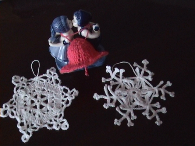 А вот еще и снежинки с колокольчиком. Правда муж сказал, что это шапочка, потом что цветок, а дочка сразу на голову начала одевать. Потом бабуля пришла и на вопрос, что это такое сказала, что шапочка. Вообщем сговорились.
