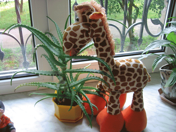 Дочка поставила своего жирафчика на окошко. И прокомментировала: "Пусть поест верблюжью колючку"