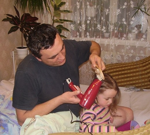 А это папа занимается ребенком, помыл голову (Лиза голову моет только с ним) и теперь сушимся (тоже хочет что бы он сушил, но это бывает как получится иногда и мама сушит)