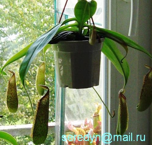 Единственное что, всегда поливайте растение дист. водой ТОЛЬКО сверху, а не с низу, как Венерину мухоловку! И давайте полностью воде стекать, прежде чем повесить его обратно. И не перепутайте местоположение относительно источника света, иначе он надолго прекратит растить кувшины!