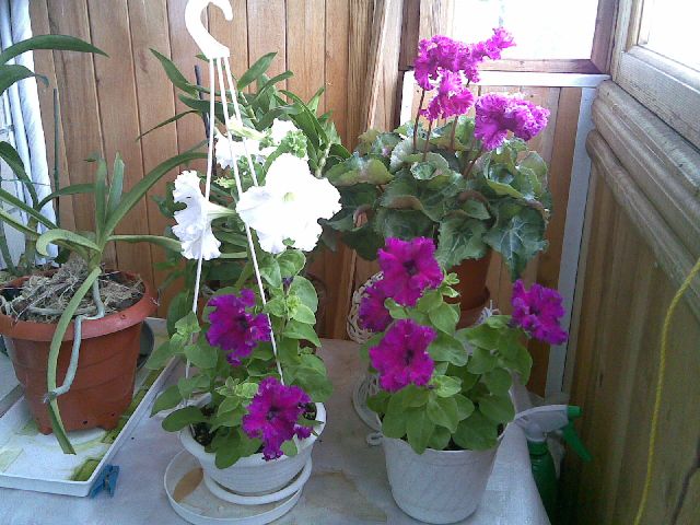А еще мой стефанотис погустел и растит много цветоносов-штук 10 точно! Теперь главное, что б зацвел - не поворачивать горшок относительно источника света. А еще хоть и не на балконе, но цветет петуния... Мелочь, но приятно