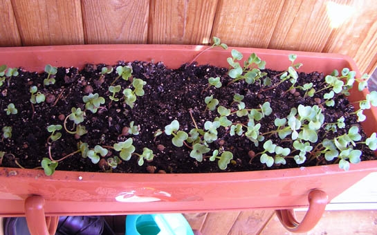 На концах ящиков бросаю семена: вниз - настурция, вверх - крученый паныч. "Солю" землю семенами укропа.