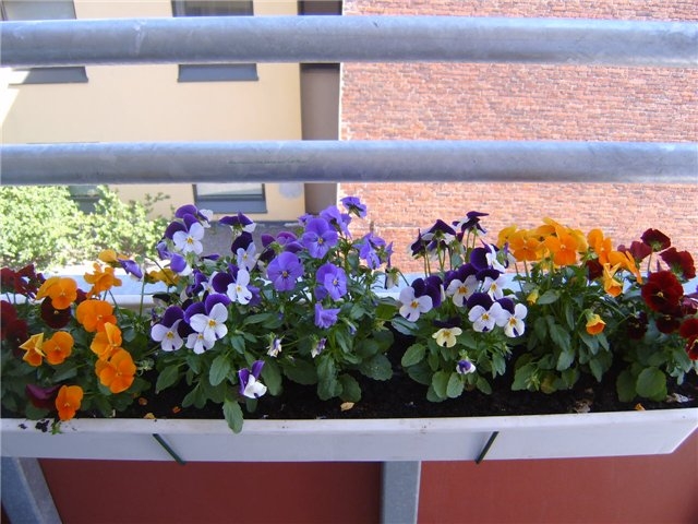 В ящиках высажены анютины глазки, рассада сальвии, агератума, лук.