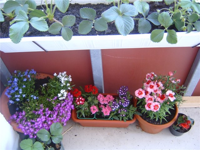 В средине июня на балконе дебри. Цветут фрезии и агератум
