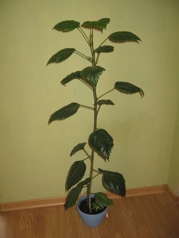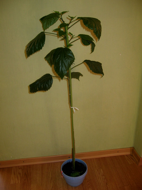 Началось все с того, что посаженый черенок гибискуса был очень ровненьким и мне захотелось сделать с него штамб. С высотой долго не могла определиться, но по мере его роста у меня все прибавлялось растений, которые в итоге на подоконнике уже помещались струдом. По сему решила, что лучше бы стоять ему на полу возле окошка- соответственно высота штамба должна быть таой, что б растение, стоя возле окна нормально освещалось солнышком. Чесно говоря высоту не меряла- так на глаз.