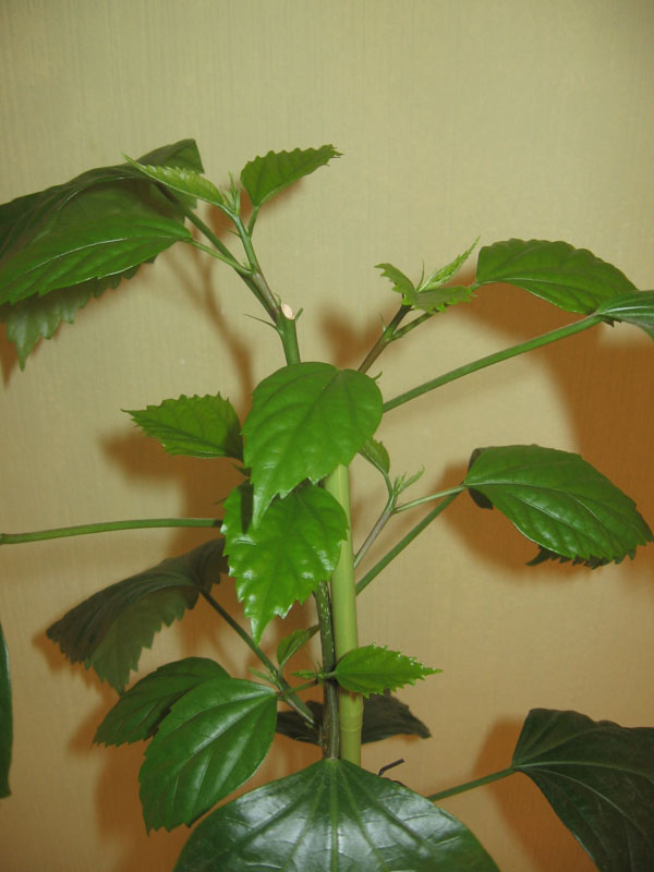 Этот черенок был посажен весной 2008г. и за лето вымахал в "здоровую детину". По мере роста боковые побеги старалась удалять еще совсем маленькими, подкармливть удобрениями с преобладанием азота для декоративно-лиственных растений.