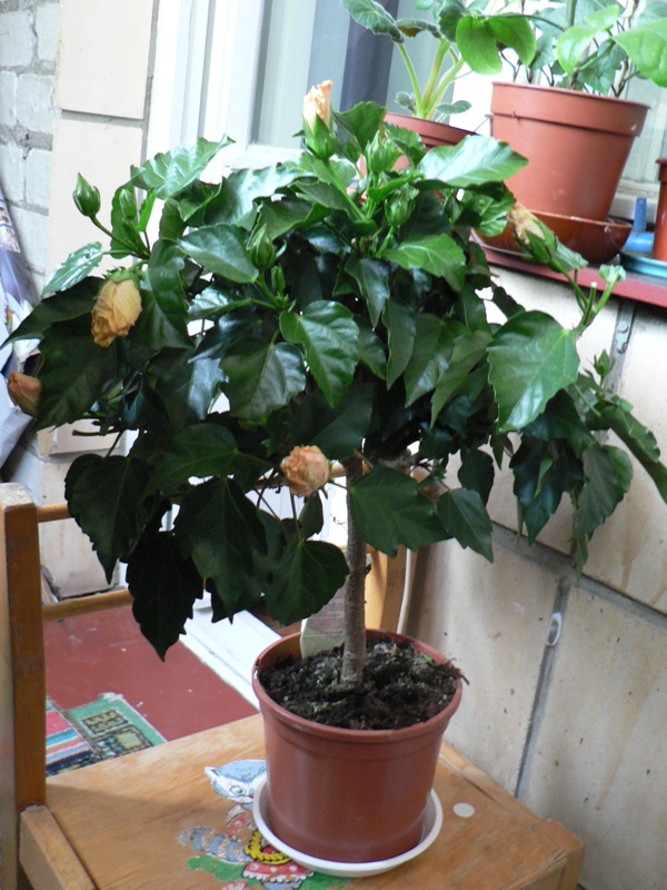 Купила штамбовый гибискус - роскошный экземпляр- персикового цвета, полумахровый! Боюсь только чтоб бутоны все не пооблетали... Надеюсь, не все облетят)))