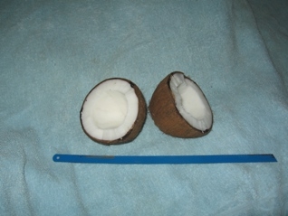 Мда, получился славненький кокосик( ну в смысле срез ровненький) по вашим советам ;-) . А сделала я вот как : Продырявила гвоздем в 2 местах дырочки (на черных пятнах), вылила сок, ножовкой сделала насечку впоперек кокоса по кругу, потом острым ножом и молотком бахнула $:004 в 4 местах по контуру насечки и он раскололся очень даже ровненько. Судите сами $:008 Всем пасибо за совет $:008
