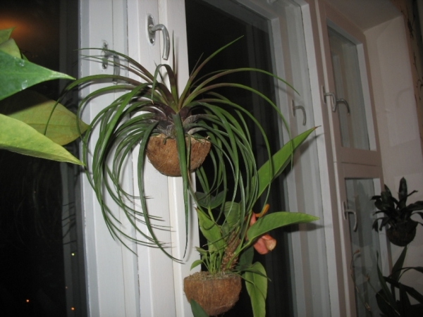 Кокосовые горшки мы делаем сами - пилили обыкновенной ножовкой. Дрелью просверлили дырочки для вентиляции, длинные корни пропустили в дырочки, обмотали мхом и проволочкой примотали к кокосу, а сверху задекорировали кокосовым волокном. Вот, что у нас получилось.