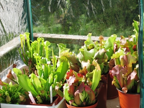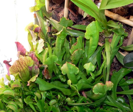 Мои саррацении прекрасно растут в орхидариуме с высокой влажностью. Есдинственное что им не хватает, это света. Та группа, что растет прямо у стекла осветителя малиново красная и имеет множество трубчатых литьев, в середине террариума они вытягиваются, им явно мало света, но растут с дикой силой, и если-бы я их не прореживал они бы забили мою камбрию да фаленопсис растущие в другом отсеке и выше на 20 см.
