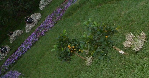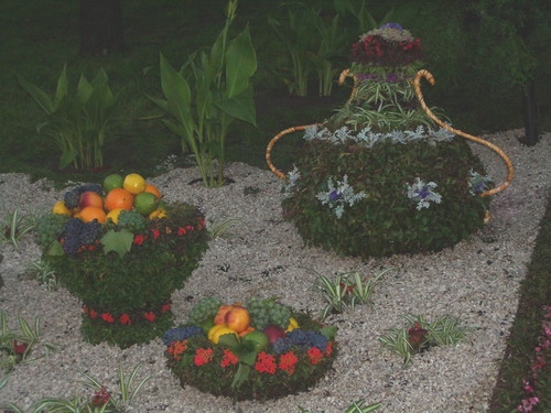 А меня больше всего впечатлили и порадовали бонсаи. Их привезли из Никополя. Это новое. В технике бонсаи были представлены карликовый гранат, можевельник, вяз, мирт, сосны и карликовая ель. Был один фикус. В основном садовые бонсаи, среднего размера (в магазинах обычно миниатюрные). Особенно понравился бонсаи гранат с плодами, склонившийся над белым камнем, и сосна на скале и с живучкой. Деревца стояли на краю склона и очень красиво смотрелись и с верхней, и с нижней терасс.[/quote]