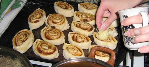 1-ый раз не смазывала пласт маслом, а просто посыпала сахаром с корицей и изюмом. А маслом помазала уже тогда, когда выложила на протвень. Так сказать, полила сверху. Булочки получились очень похожими на те, что в магазине продаются. Очень хорошо поднялись. Объедение.