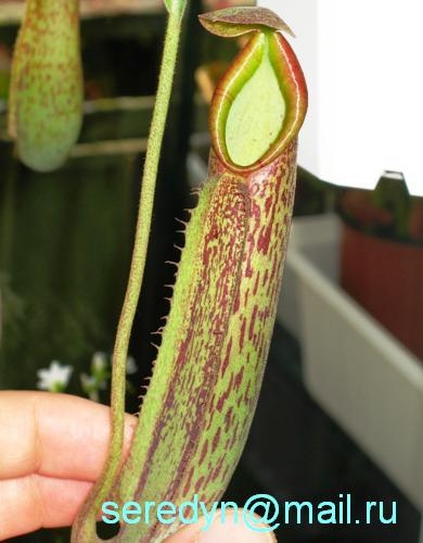 Хотелось бы получить одну консультацию по поводу непентеса,в частности-к какому виду он относиться.У тех которых я видел как правило листья узкие и лишь у края розширяется.У моего лишь у стебля лист тонкий и потом широкий.Кувшины появились только в этом году ,небольшие и имеют вдоль всего кувшина с наружной стороны как бы реснички.
