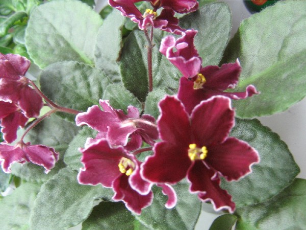 Крупная полумахровая красная звезда с белой каймой и волнистыми лепестками. Средне-зеленые простые листья.