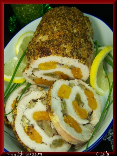 Филе разрезать и отбить. Посолить, поперчить, хорошенько полить соком лимона, свернуть и мариновать около 2 часов в холодильнике. Развернуть, положить вперемешку курагу, изюм и колотые орехи. Свернуть рулетом, уложить на фольгу и сверху полить соком лимона и тонко намазать теплым медом. Затем густо нанести горчицу, загнуть края фольги и запекать в духовке до готовности. Это божественно.