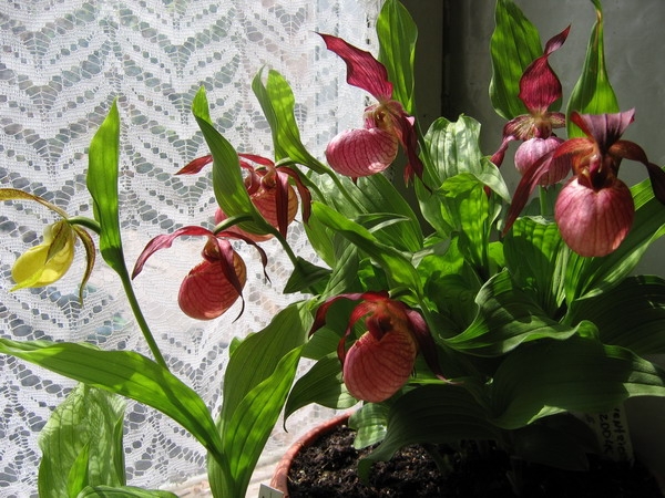 Я не знаю как называются наши сибирские башмаки, но их у нас в Красноярском крае 2 вида, один с подобными цветами, крупными малиново-красными башмаками, а вторые - башмаки в крапинку не очень крупные, но в букете смотрятся очччень шикарно. Мне их очень жалко, когда продают их в охапках, практически всей надземной частью растения, а продают их так в сезон по всему городу.