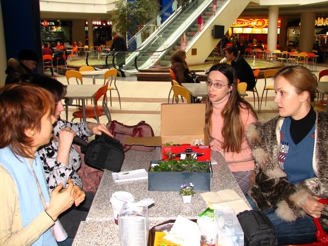 Кстати, место действительно очень удобное. Нас там много поместилось вместе с цветами, тепло и уютно. А я обнаружила, что в Макдональдсе бывает зеленый чай. :shock: Правда, холодная его разновидность была в бутылке и, подозреваю, имела к чаю отношения мало. ;-)