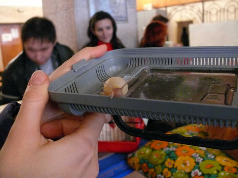 Юлины улитки громадные и производят впечатление здоровых и довольных. Там еще одна женщина была с улитками, но они у нее какие-то жалкие. Навалом валялись в пластике и все время торопились сбежать. Она их едва успевала ловить. Ей-богу, кто бы мог подумать, что улитки рабезгутся!
