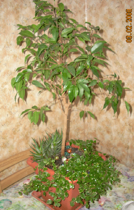 Фикус Бенджамина растет вместе с фикусом карликовым и каким-то суккулетном