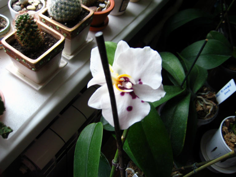Решила восстановить названия. Номер один - балый фалик или доритинопсис с хаотическим расположением бордовых пятен и широкими но заостренными лепестками. На ведре в котором купила написано: Cordoba