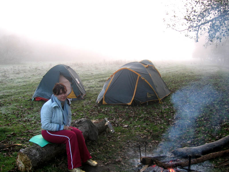 В первый день первой проблемой было то, что нас привезли в такое место, где очень мало сухих деревьев, быстро потемнело и мы лазили по кустам в темноте выискивая хоть-какие-нибудь дрова для костра (а было очень сыро, холодно и голодно). Среди ночи варили кушать и довольно поздно лягли спать- гдето в 01.00. Утром проснувшись, было очень трудно подняться из-за недосыпания и зверского холода!!! Со спальника я вылазила пол часа точно. Все вокруг было в сметанном тумане и иние, на палатке наблюдалась корочка льда. Но возле костра тепло и сухо.