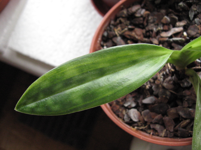 Чего-то у меня шалит паф Апплетонианум... $:014 . Получила его прошлой зимой с изъеденным улитками основанием розетки,но паф успешно с этим справился,сбросив постепенно подпорченные листья и нарастив новые(нормальные). Содержится он у меня абсолютно одинаково с остальными башмаками. А этим летом стал растить вот такие листья с желтыми полосочками (даже красиво $:097 ). На фотке видно отличие нижних нормальных листьев от листьев с полосочками.