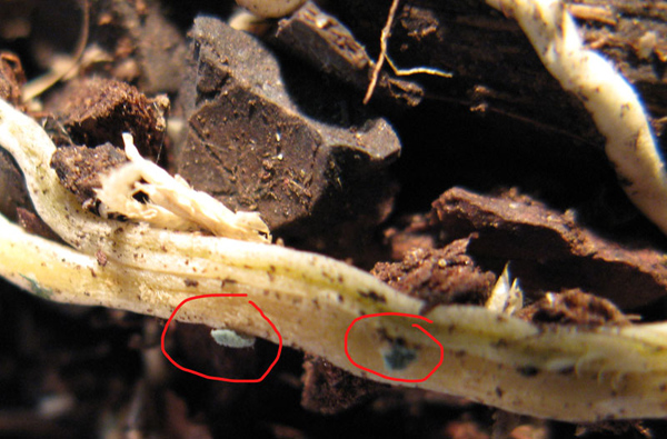 Тут тоже самое - под бульбой это такой же блок...только очень на мох похоже резаный. И тоже кубиком таким. Учитывая, что ещё и инфекция появилась, растюха стала ускоренно загибаться.