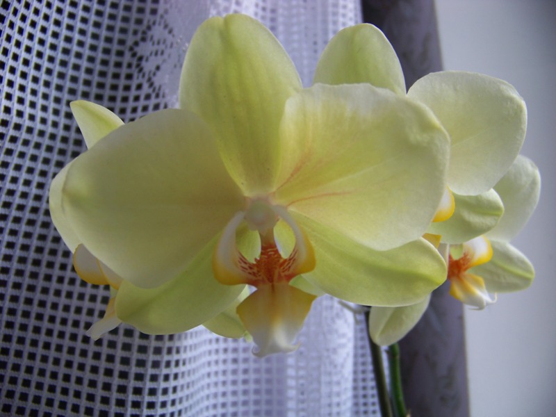 Куплен весной, цветущим, малиновым, летом процвел повторно малиновым на старых цветоносах, на кончиках образовывались новые бутоны, это зимнее цветение, с совершенно неожиданной окраской, фал гибридный голландец из Эдельвейса (одесского).