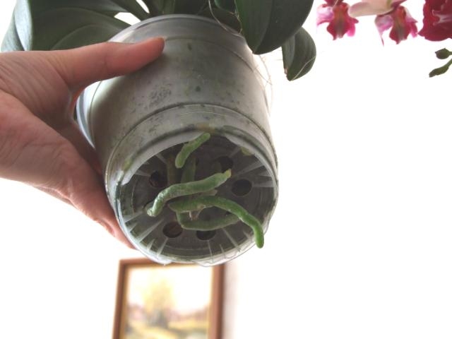 Прочитав у вас на форуме рекомендации по пересадке, решила пересадить вот эту, но к сожалению у нее корни проросли вниз горшка сквозь отверстия. Боюсь , что я их сломаю т.к. они толстые и упругие.