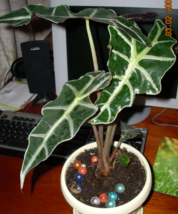 А у меня вот такая алоказия-чёрный бархат,или блек вельвет.Выращена мной из клубеньков