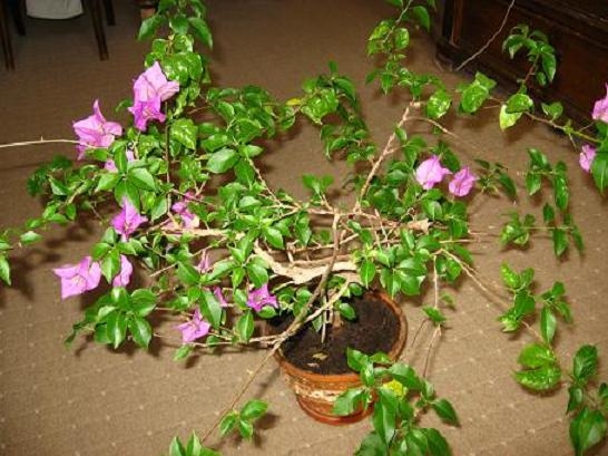 Чтобы хорошо цвёл, желателен период покоя зимой. Терпит довольно низкие температуры, почти до ноля градусов (если растение уже взрослое). Это значит что цветок может быть на застеклённом балконе до глубокой осени, а то и до Нового года, если зима мягкая. Конечно, если Вы его потом резко занесёте в сухую тёплую комнату, он сбросит листья, может даже полностью, но не стоит этого бояться. Они потом отрастут вновь, только деревце, потерявшее листья, поливайте месяц- полтора крайне мало, лишь бы корни не засохли. В феврале начнёте поливать больше, и листья снова полезут. После такой жизни бугенвиллея будет только лучше цвести.