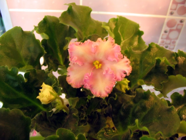 Он по краям нежно-розывый, а в цетре желтоватая полоса, переливы цвета действительно, рассветные