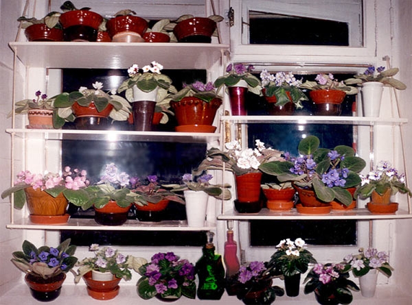 У меня окна выходят на южную сторону и стелажи сделаны размером на всю глухую сторону окна. Мы пересмотрели кучу вариантов и остановились на каркасе из ДСП и и полочках из 6 мм стекла. Солнца хватает и нам в комнате, и цветам $:013