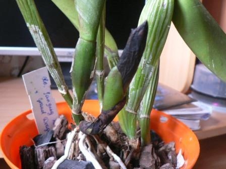 У меня такая же картина на двух каттлеях. Полила, потом 2 недели не поливала-прохладно было на балконе.... глянула-половина бульб черные, резала 2\3 куртины.