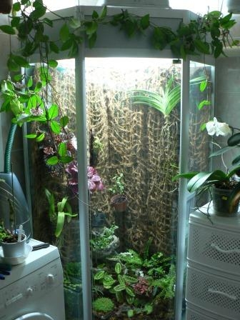 Да работает.Влажность высокая,но меняется от 70 (ночью)до 100%(вечером при включенной только декоративной подсветке-туман мгновенно повисает).Когда воздух прогревается от лампы ДНаТ,от тумана не остается и следа,влажность немного падает,я включаю увлажнитель на большую мощность.Так что рекомендую всем такой способ размещения увлажнителя(на фото он слева,на стиральной машине).К тому же облегчается доступ к нему для долива воды и электронная начинка не страдает от высокой влажности.Akhenaten писал(а): Я, а в вашем орхидариме по прежнему работает увлажнитель, и какова в нем влажность? Высокая влажность - главная причина образования кувшинов, кроме хорошего света.
